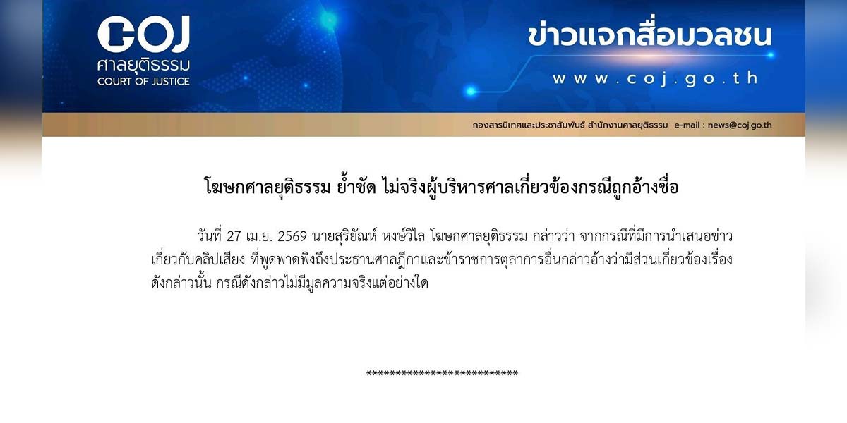 ล่าสุดวันนี้(27 เม.ย.2569) นายสุริยัณห์ หงษ์วิไล โฆษกศาลยุติธรรม กล่าวว่า จากกรณีที่มีการนำเสนอข่าวเกี่ยวกับคลิปเสียง ที่พูดพาดพิงถึงประธานศาลฎีกาและข้าราชการตุลาการอื่นกล่าวอ้างว่ามีส่วนเกี่ยวข้องเรื่องดังกล่าวนั้น กรณีดังกล่าวไม่มีมูลความจริงแต่อย่างใด