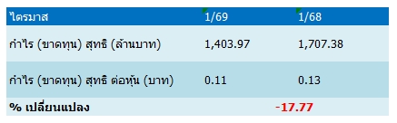 โดยบริษัทฯ มีกำไรสุทธิเท่ากับ 1,403.97 ล้านบาท ปรับตัวลดลง 303.41 ล้านบาท หรือลดลง 17.77% เมื่อเทียบกับช่วงเดียวกันของปีก่อน ทั้งนี้ ในส่วนของรายได้รวมในไตรมาส 1/2569 มีจำนวน 17,149.05 ล้านบาท ลดลง 1,505.42 ล้านบาท หรือลดลง 8.07% เมื่อเทียบกับช่วงเดียวกันของปีก่อน โดยปัจจัยหลักมาจากการลดลงของรายได้จากสัญญาที่ทำกับลูกค้า (รายได้จากการขายสินค้าและบริการ) ซึ่งทำได้ 16,041.90 ล้านบาท ลดลง 8.58% เมื่อเทียบกับช่วงเดียวกันของปีก่อน เนื่องจากบริษัทฯ ต้องเผชิญกับฐานรายได้ที่สูงในปีที่ผ่านมา (High Base Effect) จากมาตรการ Easy E-Receipt ของภาครัฐ ผนวกกับภาพรวมเศรษฐกิจไทยที่ยังคงชะลอตัว และความกังวลต่อสถานการณ์ความขัดแย้งในตะวันออกกลางที่กดดันต้นทุนพลังงาน ส่งผลกระทบต่อความเชื่อมั่นและกำลังซื้อของผู้บริโภค