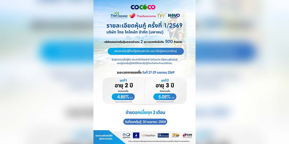 COCOCO เดินหน้าเสนอขายหุ้นกู้อายุ 2-3 ปี ชูอัตราดอกเบี้ย 4.85–5.05% เปิดจอง 27-29 เม.ย.นี้ หวังระดมทุนขยายกำลังการผลิต-รุกโรงงานฟิลิปปินส์ รองรับออเดอร์ตลาดโลกที่โตต่อเนื่อง