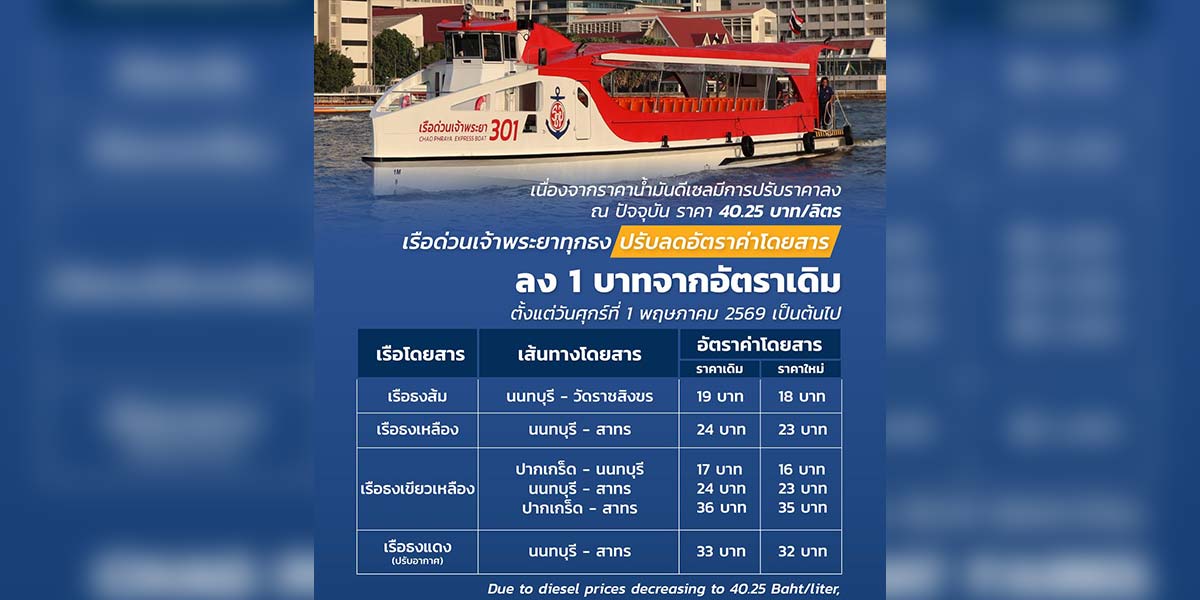 เรือด่วนเจ้าพระยา ประกาศลดค่าโดยสารทุกประเภทลง 1 บาท มีผล 1 พ.ค. 69 รับอานิสงส์ราคาน้ำมันดีเซลปรับลดลงเหลือ 40.25 บาท/ลิตร พร้อมย้ำหากราคาน้ำมันลดลงอีก บริษัทฯ พร้อมปรับลดค่าตั๋วเพิ่มเติม