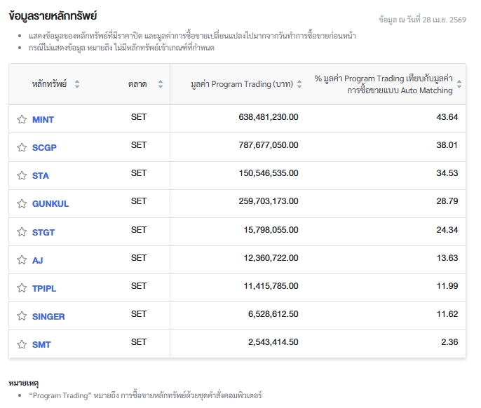 นอกจากนี้ ตลาดหลักทรัพย์แห่งประเทศไทย (ตลท.) รายงานข้อมูลหลักทรัพย์ที่มีการซื้อขายผ่านระบบ Program Trading สูงสุด โดยพิจารณาจากสัดส่วนมูลค่า Program Trading เทียบกับมูลค่าการซื้อขายแบบ Auto Matching พบว่ามี หลักทรัพย์ที่มีการทำรายการสูงสุดในวันนี้ ได้แก่