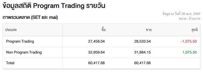 ผู้สื่อข่าวรายงานว่า วันนี้ (28 เม.ย.69) ตลาดหลักทรัพย์แห่งประเทศไทย (ตลท.) เปิดเผยข้อมูลซื้อขายรายวันผ่าน Program Trading หรือ “โปรแกรมโรบอทเทรดดิ้ง” พบว่ามีมูลค่าซื้อจำนวน 27,458.04 ล้านบาท และมูลค่าขายจำนวน 28,533.54 ล้านบาท เท่ากับซื้อขายสุทธิ 1,075.50 ล้านบาท
