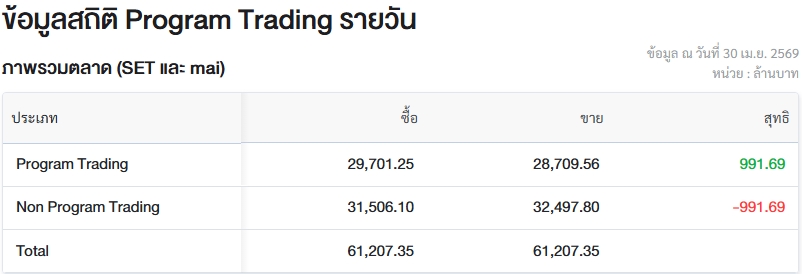 ผู้สื่อข่าวรายงานว่า วันนี้ (30 เม.ย.69) ตลาดหลักทรัพย์แห่งประเทศไทย (ตลท.) เปิดเผยข้อมูลซื้อขายรายวันผ่าน Program Trading หรือ “โปรแกรมโรบอทเทรดดิ้ง” พบว่ามีมูลค่าซื้อจำนวน 29,701.25 ล้านบาท และมูลค่าขายจำนวน 28,709.56 ล้านบาท เท่ากับซื้อสุทธิ 991.69 ล้านบาท