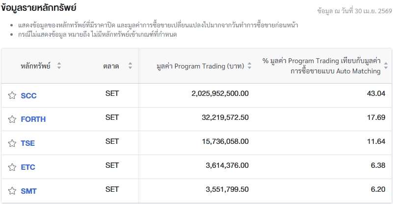 โดย บริษัท ปูนซิเมนต์ไทย จำกัด (มหาชน) หรือ SCC มีมูลค่าการซื้อขายผ่าน Program Trading จำนวน 2,025.95 ล้านบาท คิดเป็น 43.04% ของมูลค่าการซื้อขายแบบ Auto Matching ซึ่งอยู่ที่ 4,707.99 ล้านบาท