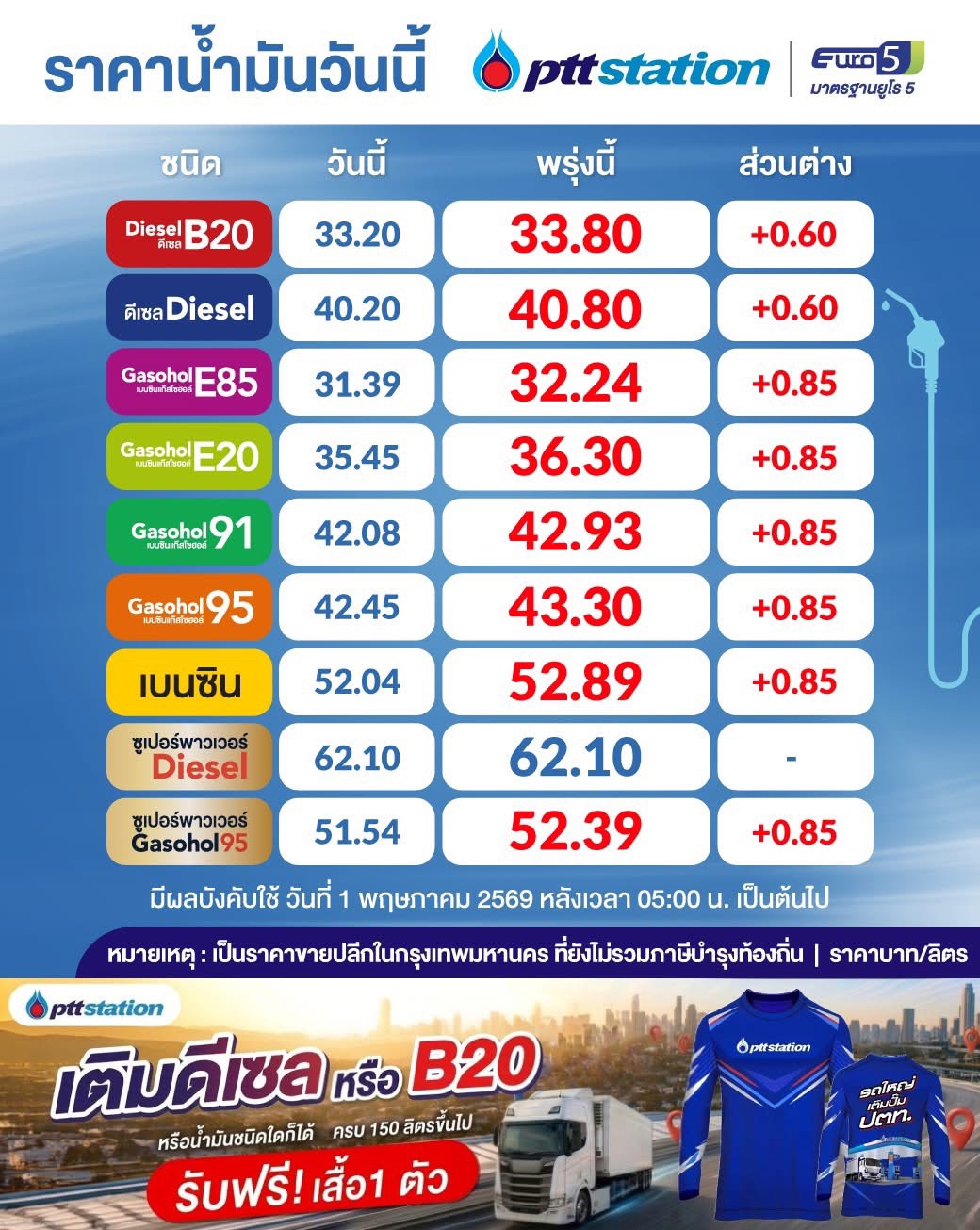 ทั้งนี้ ราคาขายปลีกใหม่ของ OR ผ่านสถานีบริการ PTT Station ประกอบด้วย ดีเซล B20 อยู่ที่ 33.80 บาทต่อลิตร, ดีเซล อยู่ที่ 40.80 บาทต่อลิตร, แก๊สโซฮอล์ E85 อยู่ที่ 32.24 บาทต่อลิตร, แก๊สโซฮอล์ E20 อยู่ที่ 36.30 บาทต่อลิตร, แก๊สโซฮอล์ 91 อยู่ที่ 42.93 บาทต่อลิตร, แก๊สโซฮอล์ 95 อยู่ที่ 43.30 บาทต่อลิตร และเบนซิน อยู่ที่ 52.89 บาทต่อลิตร