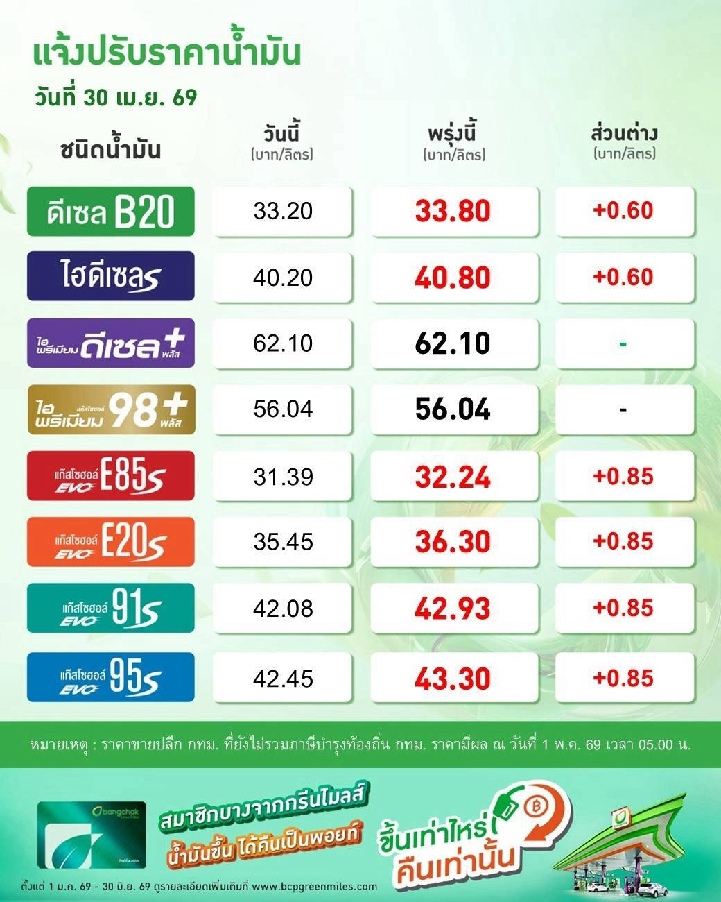 ด้าน BCP ประกาศปรับราคาขายปลีกน้ำมันผ่านสถานีบริการบางจากเช่นกัน โดยดีเซล B20 ปรับขึ้น 0.60 บาทต่อลิตร มาอยู่ที่ 33.80 บาทต่อลิตร และไฮดีเซลปรับขึ้น 0.60 บาทต่อลิตร มาอยู่ที่ 40.80 บาทต่อลิตร ส่วนไฮพรีเมียมดีเซล S+ คงราคาเดิมที่ 62.10 บาทต่อลิตร