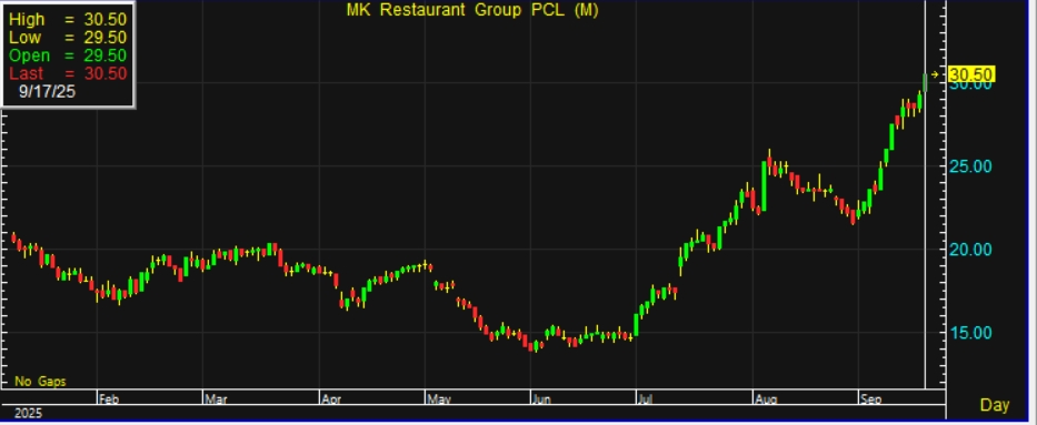 สำหรับราคาหุ้น M ปรับตัวขึ้นต่อเนื่อง รับอานิสงส์หลัง นางสาวทานตะวัน ธีระโกเมน กรรมการผู้จัดการใหญ่ บมจ.เอ็มเค เรสโตรองต์ กรุ๊ป กล่าวว่า บริษัทเดินเกมรุกหนักตลาดบุฟเฟต์ วางยุทธศาสตร์ครอบคลุมทุกเซกเมนต์ เพื่อเข้าถึงฐานลูกค้าทุกกลุ่ม พร้อมต่อยอด สร้าง MK Premium Buffet คุณภาพระดับ MK โดดเด่นด้วยวาไรตี้ มาพร้อมทั้ง เป็ดย่าง หมูแดง หมูกรอบ ติ่มซำ เครื่องดื่ม ของหวาน พร้อมเมนูสุกี้คุณภาพและเมนูซิกเนเจอร์ของ MK กว่า130 เมนู ราคาเข้าถึงง่าย เริ่มต้น 499 บาท ไม่มีบวกเพิ่ม ตอบโจทย์ทั้งกลุ่มลูกค้าเดิมและกลุ่มใหม่ที่มองหาความคุ้มค่าพร้อมคุณภาพ ประกาศปรับรูปแบบบุฟเฟต์ใหม่รวม 8 สาขาทันที