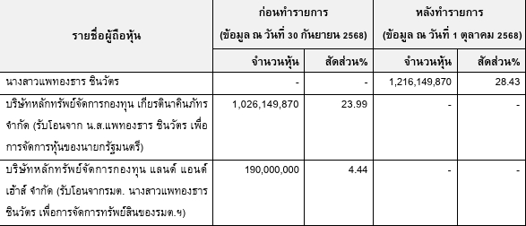 SC แจ้งตลาดหลักทรัพย์ฯ ว่า “แพทองธาร ชินวัตร” อดีตนายกรัฐมนตรี รับโอนหุ้น 1,216.15 ล้านหุ้น คิดเป็นสัดส่วน 28.43% ของสิทธิออกเสียงทั้งหมดในกิจการ จากบลจ.เกียรตินาคินภัทร-บลจ.แลนด์ แอนด์ เฮ้าส์ ตาม พ.ร.บ.จัดการหุ้นรัฐมนตรี กลับมาเป็นผู้ถือหุ้นใหญ่อันดับ 1