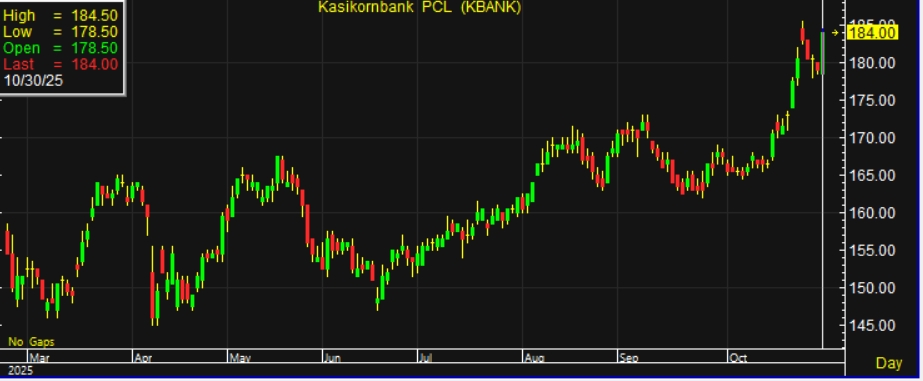 ผู้สื่อข่าวรายงานว่า วันนี้ (30 ต.ค.68) ราคาหุ้น ธนาคารกสิกรไทย จำกัด (มหาชน) หรือ KBANK ณ เวลา 14:31 น. อยู่ที่ระดับ 184.00 บาท บวก 5.00 บาท หรือ 2.79% สูงสุดที่ระดับ 184.50 บาท ต่ำสุดที่ระดับ 178.50 บาท ด้วยมูลค่าการซื้อขาย 2,251.08 ล้านบาท