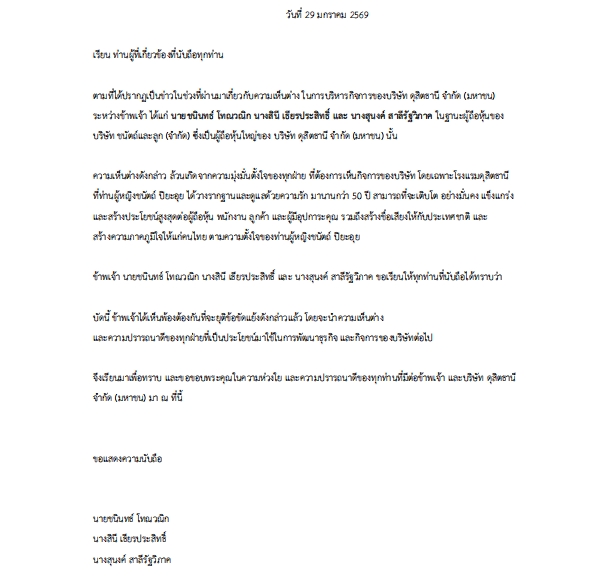ผู้สื่อข่าวรายงานว่า วันนี้ (29 ม.ค.69) มีการเปิดเผยแถลงการณ์ จาก นายชนินทธ์ โทณวณิก นางสินี เธียรประสิทธิ์ และนางสุนงค์ สาลีรัฐวิภาค เกี่ยวกับกรณีความเห็นต่างในการบริหาร บริษัท ดุสิตธานี จำกัด (มหาชน) หรือ DUSIT ซึ่งเป็นประเด็นความขัดแย้งภายในตระกูลผู้ก่อตั้งที่ดำเนินมาเป็นเวลาหลายปี