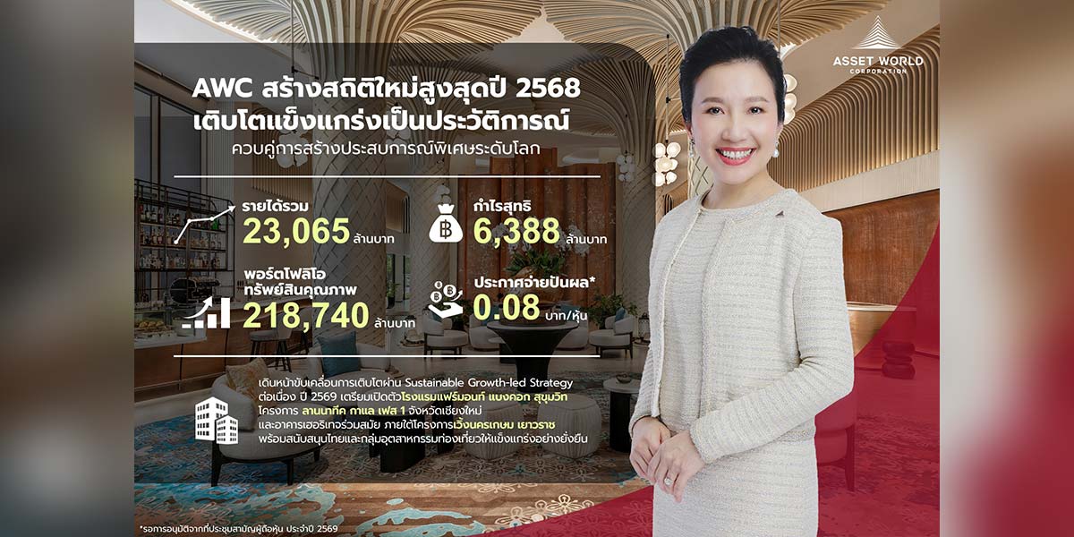 นางวัลลภา ไตรโสรัส ประธานเจ้าหน้าที่บริหารและกรรมการผู้จัดการใหญ่ บริษัท แอสเสท เวิรด์ คอร์ป จำกัด (มหาชน) หรือ AWC เปิดเผยผลการดำเนินงานปี 2568 ทำสถิติสูงสุดเป็นประวัติการณ์ โดยบริษัทมีรายได้รวม 23,065 ล้านบาท เพิ่มขึ้นร้อยละ 9.8 จากปีก่อน และมีกำไรสุทธิ 6,388 ล้านบาท เพิ่มขึ้นร้อยละ 9.2 จากปีก่อน ขณะที่มูลค่าพอร์ตโฟลิโอทรัพย์สินคุณภาพขยายตัวสู่ 218,740 ล้านบาท เพิ่มขึ้นร้อยละ 10.0 จากปีก่อน พร้อมประกาศจ่ายเงินปันผล 0.08 บาทต่อหุ้น เพิ่มขึ้นร้อยละ 6.7 จากปีก่อน
