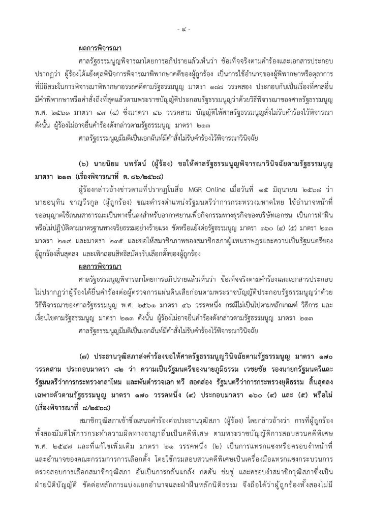 ผู้สื่อข่าวรายงานว่า วันนี้ (17 ก.ย.68) ศาลรัฐธรรมนูญ พิจารณาเรื่องที่ ต.86/2568 คำร้องของนายนิยม นพรัตน์ (ผู้ร้อง) กล่าวอ้างข่าวตามที่ปรากฏในสื่อ MGR Online เมื่อวันที่ 15 มิถุนายน 2568 ว่า นายอนุทิน ชาญวีรกูล (ผู้ถูกร้อง) ขณะดำรงตำแหน่งรัฐมนตรีว่าการกระทรวงมหาดไทย ใช้อำนาจหน้าที่ขออนุญาตใช้ถนนสาธารณะเป็นทางขึ้นลงสำหรับอากาศยานเพื่อกิจกรรมทางธุรกิจของบริษัทเอกชน