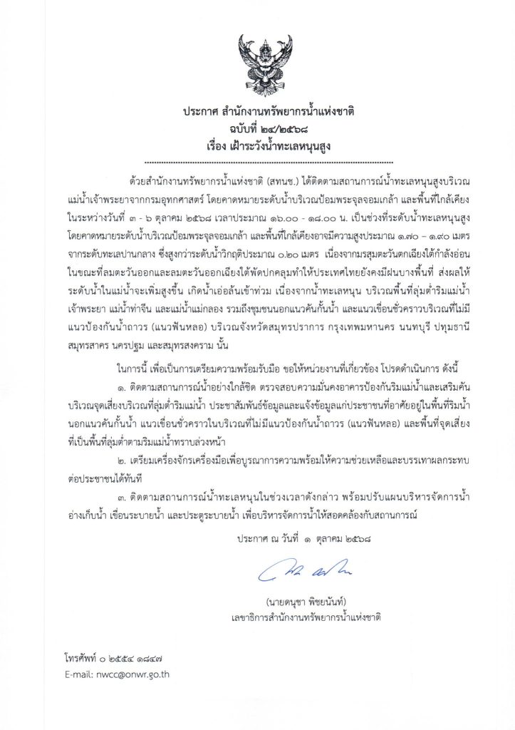 ขณะเดียวกัน นายดนุชา พิชยนันท์ เลขาธิการสำนักงานทรัพยากรน้ำแห่งชาติ (สทนช.) ได้ออกประกาศเตือนให้เฝ้าระวังสถานการณ์น้ำทะเลหนุนสูง ตามที่กรมอุทกศาสตร์คาดหมายระดับน้ำบริเวณป้อมพระจุลจอมเกล้าและพื้นที่ใกล้เคียง ระหว่างวันที่ 3–6 ตุลาคม 2568 เวลาประมาณ 16:00–18:00 น. โดยคาดว่า ระดับน้ำจะอยู่ที่ 1.70–1.90 เมตร จากระดับทะเลปานกลาง ซึ่งสูงกว่าระดับวิกฤติราว 0.20 เมตร