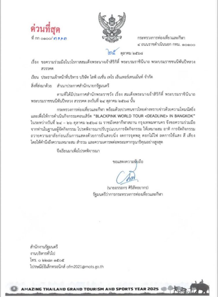 กระทรวงการท่องเที่ยวและกีฬา ทำหนังสือถึงผู้จัดคอนเสิร์ต “BLACKPINK WORLD TOUR IN BANGKOK” ขอความร่วมมือปรับรูปแบบการแสดงให้เหมาะสมกับช่วงไว้อาลัย สมเด็จพระนางเจ้าสิริกิติ์ พระบรมราชินีนาถ พระบรมราชชนนีพันปีหลวง ขณะที่ Live Nation ประกาศเชิญผู้ชมแต่งกายขาว-ดำ วันที่ 25–26 ตุลาคมนี้
