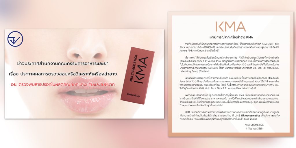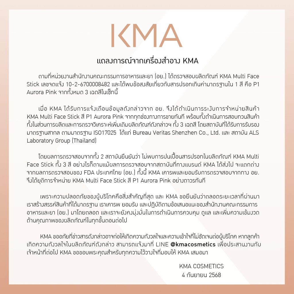 เพจ “KMA Cosmetics” โพสต์เมื่อวันที่ 4 กันยายน 2568: https://www.facebook.com/kmacosmetics/posts/pfbid0Kv2BeXWYvzgYY9dudnTQr47sXJ1aCuXkUFAxXddZgDvFf4GWGpS2z7x5s3jZk1uYl