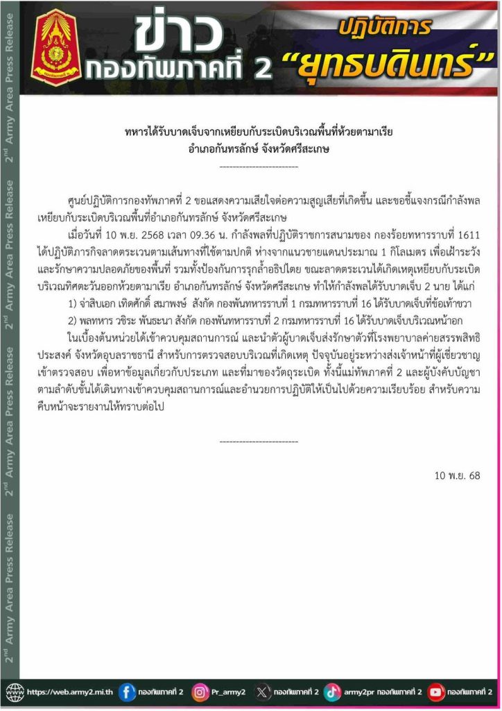 ผู้สื่อข่าวรายงานว่า วันนี้ (10 พ.ย.68) เวลา 11:47 น. นายสิริพงศ์ อังคสกุลเกียรติ โฆษกประจำสำนักนายกรัฐมนตรี เปิดเผยว่า นายอนุทิน ชาญวีรกูล นายกรัฐมนตรีและรัฐมนตรีว่าการกระทรวงมหาดไทย ได้รับรายงานเหตุการณ์จากกองทัพบก กรณีมีทหารไทยเหยียบกับระเบิด บริเวณพื้นที่ห้วยตามาเรีย จังหวัดศรีสะเกษ ส่งผลให้ได้รับบาดเจ็บ 2 นาย และได้ดำเนินการส่งตัวเข้าทำการรักษาเรียบร้อยแล้ว