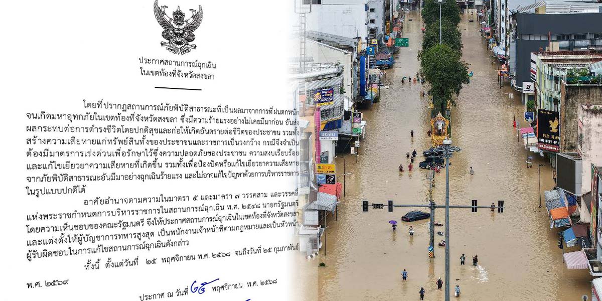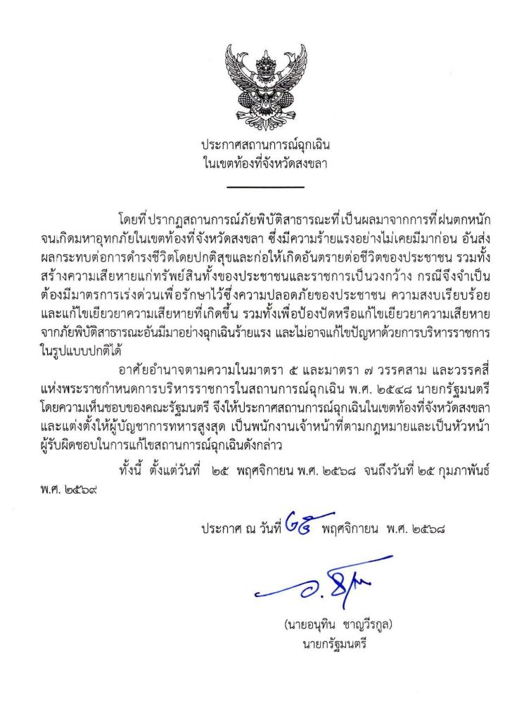 ผู้สื่อข่าวรายงานว่า วันนี้ (25 พ.ย.68) นายอนุทิน ชาญวีรกูล นายกรัฐมนตรี ได้ลงนามประกาศสถานการณ์ฉุกเฉินในเขตท้องที่จังหวัดสงขลา ภายหลังเกิดสถานการณ์ภัยพิบัติสาธารณะจากฝนตกหนักต่อเนื่อง จนก่อให้เกิดมหาอุทกภัยในหลายพื้นที่ ซึ่งมีความร้ายแรงอย่างไม่เคยปรากฏมาก่อน