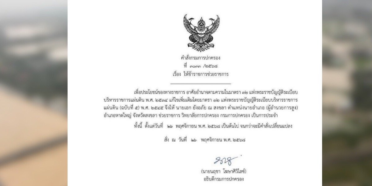 ผู้สื่อข่าวรายงานว่า ค่ำวันนี้ (26 พ.ย.68) มีการเผยแพร่คำสั่งกรมการปกครอง ที่ 3033/2568 เรื่องให้ข้าราชการช่วยราชการ ลงนามโดย นายนฤชา โฆษาศิวิไลซ์ อธิบดีกรมการปกครอง