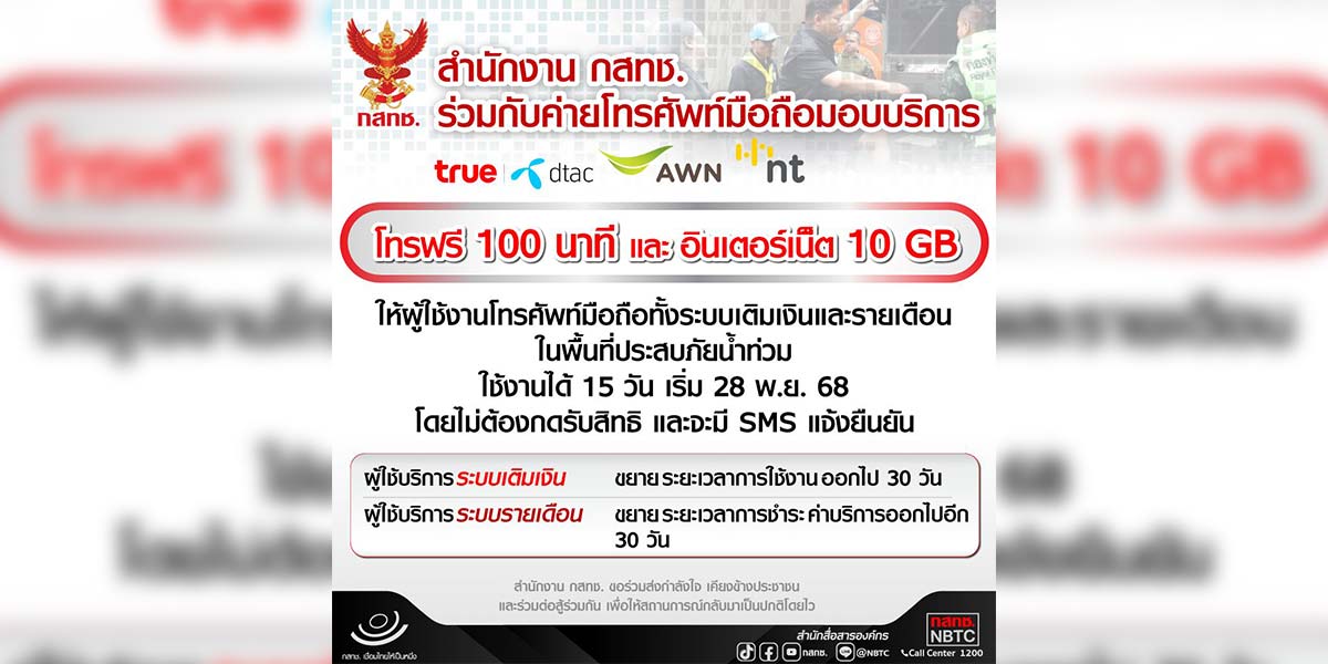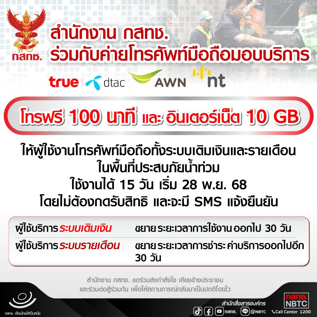 ผู้สื่อข่าวรายงานว่า วันนี้ (28 พ.ย.68) สำนักงานคณะกรรมการกิจการกระจายเสียง กิจการโทรทัศน์ และกิจการโทรคมนาคมแห่งชาติ (กสทช.) เปิดเผยว่า ได้ร่วมกับผู้ให้บริการโทรศัพท์เคลื่อนที่ทุกค่าย มอบสิทธิใช้งานโทรฟรี 100 นาที และอินเทอร์เน็ต 10GB ให้แก่ผู้ใช้บริการทั้งระบบเติมเงินและระบบรายเดือน ในพื้นที่ประสบภัยน้ำท่วม โดยสามารถใช้งานได้เป็นเวลา 15 วัน เริ่มตั้งแต่วันที่ 28 พฤศจิกายน 2568 เป็นต้นไป โดยไม่ต้องกดรับสิทธิ พร้อมมี SMS แจ้งยืนยันสิทธิให้ทราบ