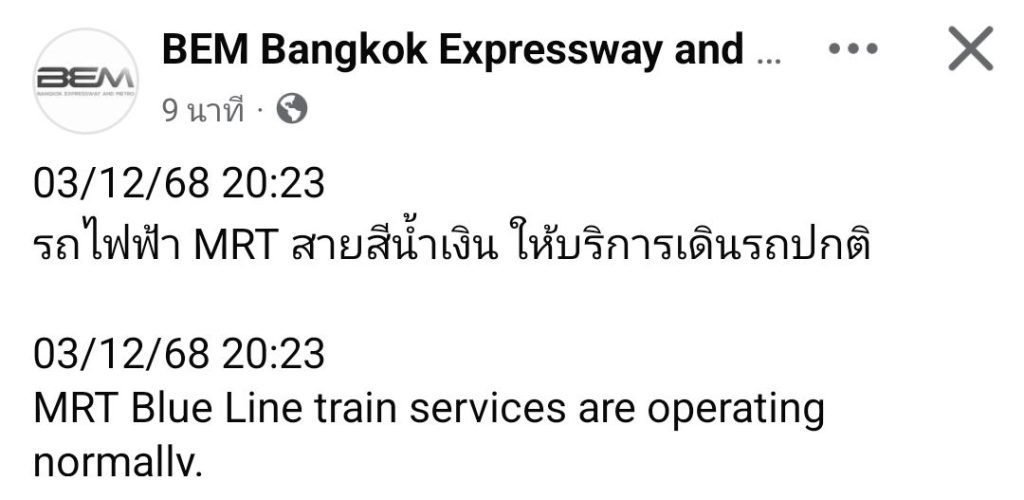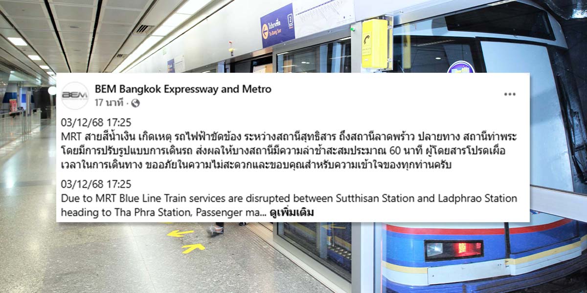 ผู้สื่อข่าวรายงานว่า วันนี้ (3 ธ.ค. 2568) บริษัท ทางด่วนและรถไฟฟ้ากรุงเทพ จำกัด (มหาชน) หรือ BEM แจ้งผ่านเพจเฟซบุ๊กทางการ BEM Bangkok Expressway and Metro เมื่อเวลา 17:25 น. ว่า ระบบรถไฟฟ้า MRT สายสีน้ำเงิน เกิดเหตุขัดข้องในช่วงสถานีสุทธิสาร–สถานีลาดพร้าว ส่งผลให้ต้องปรับรูปแบบการเดินรถ โดยขบวนที่มุ่งหน้าไปยังปลายทางสถานีท่าพระได้รับผลกระทบด้านความเร็วและความถี่ในการเดินรถ