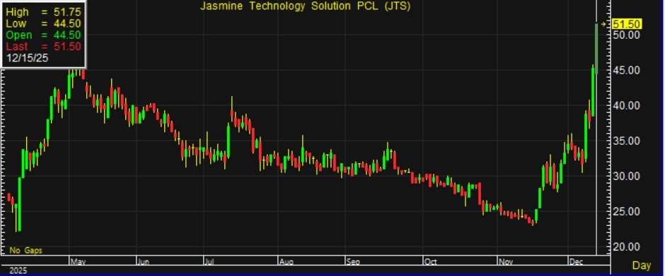ผู้สื่อข่าวรายงานว่า วันนี้ (15 ธ.ค. 68) ราคาหุ้น บริษัท จัสมิน เทคโนโลยี โซลูชั่น จำกัด (มหาชน) หรือ JTS ณ เวลา 10:19 น. อยู่ที่ระดับ 51.50 บาท บวก 6.25 บาท หรือ 13.81% สูงสุดที่ระดับ 51.75 บาท ต่ำสุดที่ระดับ 44.50 บาท ด้วยมูลค่าการซื้อขาย 122.37 ล้านบาท พร้อมสร้างสถิติราคาสูงสุดในรอบกว่า 11 เดือน