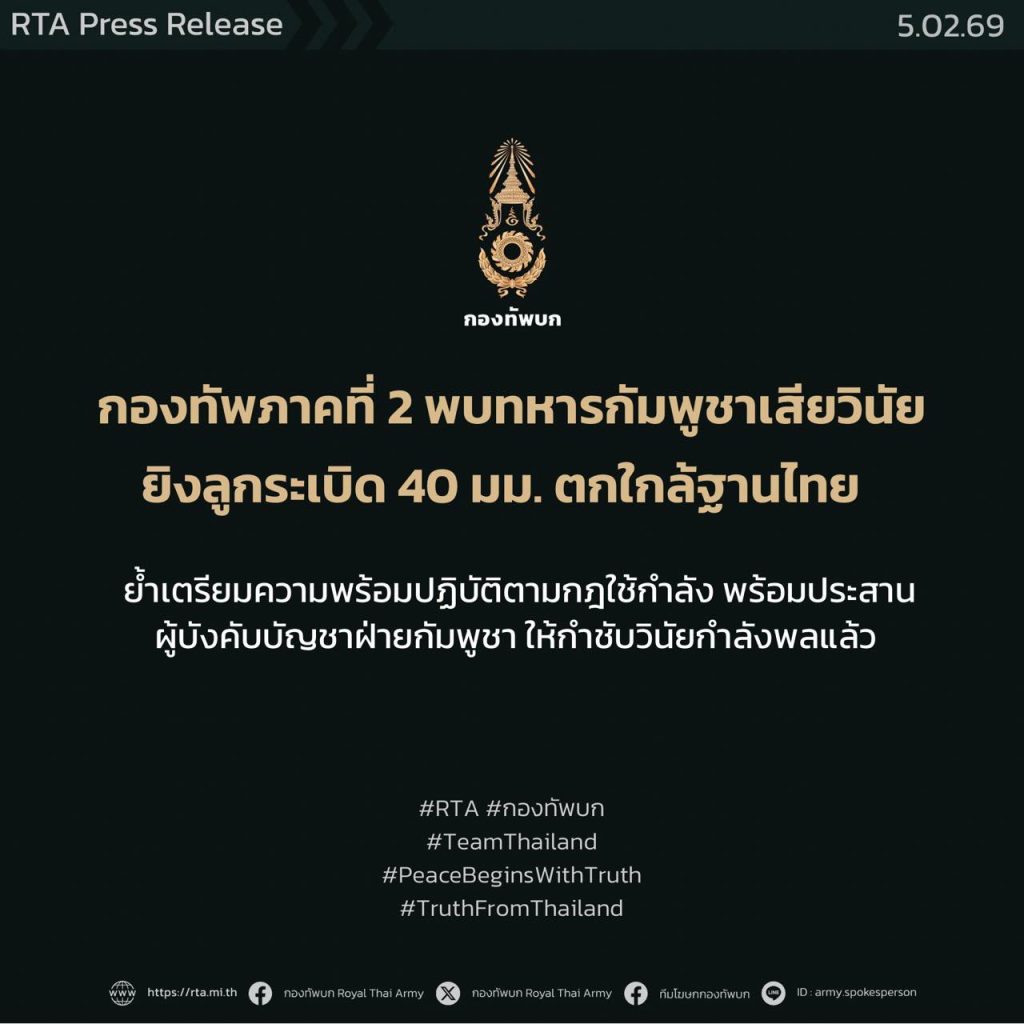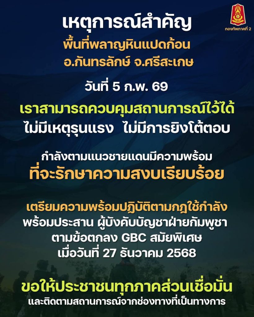 ผู้สื่อข่าวรายงานว่า วันนี้ (5 ก.พ.69) ทีมโฆษกกองทัพบก รายงานว่า กองทัพภาคที่ 2 ได้รับแจ้งเหตุพบการยิงลูกระเบิดขนาด 40 มิลลิเมตร ตกใกล้ฐานปฏิบัติการฝ่ายไทย ในพื้นที่อำเภอกันทรลักษ์ จังหวัดศรีสะเกษ เมื่อเวลาประมาณ 10.20 น. โดยไม่มีกำลังพลได้รับบาดเจ็บ