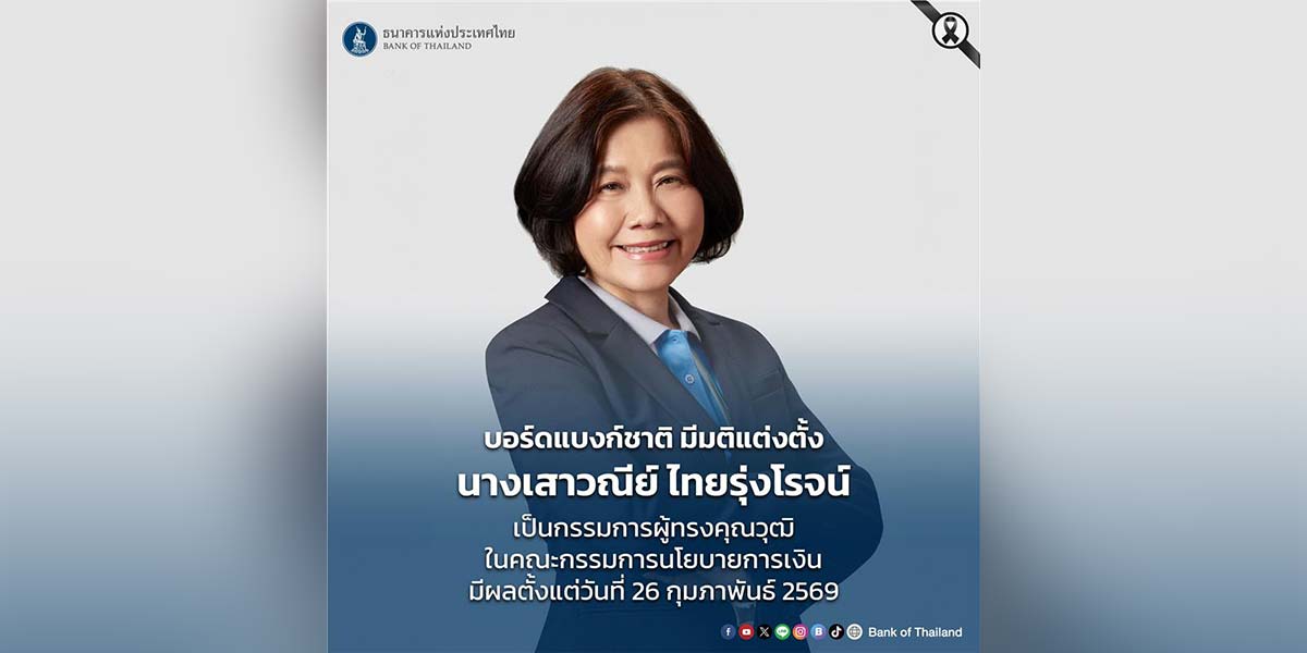 บอร์ด ธปท. มีมติแต่งตั้ง “เสาวณีย์ ไทยรุ่งโรจน์” เป็นกรรมการผู้ทรงคุณวุฒิใน กนง. แทนตำแหน่งที่ว่างจากการลาออก เริ่มมีผล 26 ก.พ. 69 วาระถึง 31 ต.ค. 69