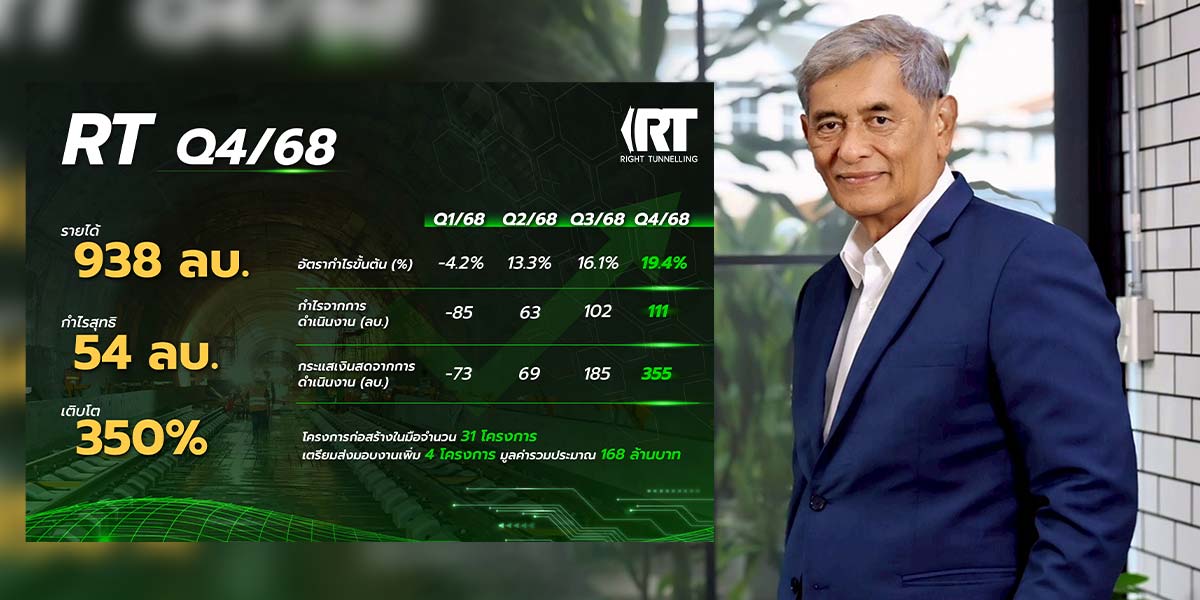 นายชวลิต ถนอมถิ่น ประธานเจ้าหน้าที่บริหาร บริษัท ไร้ท์ทันเน็ลลิ่ง จำกัด (มหาชน) หรือ RT ผู้เชี่ยวชาญพิเศษด้านขุดเจาะอุโมงค์ วิศวกรรมโยธา และ ธรณีเทคนิคครบวงจร เปิดเผยถึง ผลประกอบการไตรมาส 4 ปี 2568 ว่าบริษัทมีรายได้รวม 938 ล้านบาท ลดลงจากช่วงเดียวกันปีก่อนที่มีรายได้รวม 970 ล้านบาท จำนวน 32 ล้านบาท หรือลดลง 3% และมีกำไรสุทธิ 54 ล้านบาท เพิ่มขึ้นจากช่วงเดียวกันปีก่อนที่มีกำไรสุทธิ 12 ล้านบาท จำนวน 42 ล้านบาท หรือเพิ่มขึ้น 350%