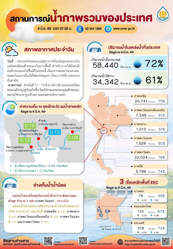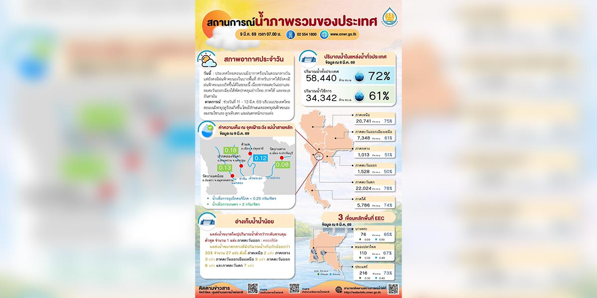 ผู้สื่อข่าวรายงานว่า วันนี้ (9 มี.ค.69) สำนักงานทรัพยากรน้ำแห่งชาติ (สทนช.) รายงานสรุปสถานการณ์น้ำภาพรวมของประเทศ ณ เวลา 07.00 น. โดยระบุว่า ประเทศไทยตอนบนมีอากาศร้อนในตอนกลางวัน และมีฝนฟ้าคะนองบางพื้นที่ ขณะที่ภาคใต้ยังมีฝนฟ้าคะนองในระยะนี้ เนื่องจากลมตะวันออกและลมตะวันออกเฉียงใต้พัดปกคลุมอ่าวไทย ภาคใต้ และทะเลอันดามัน