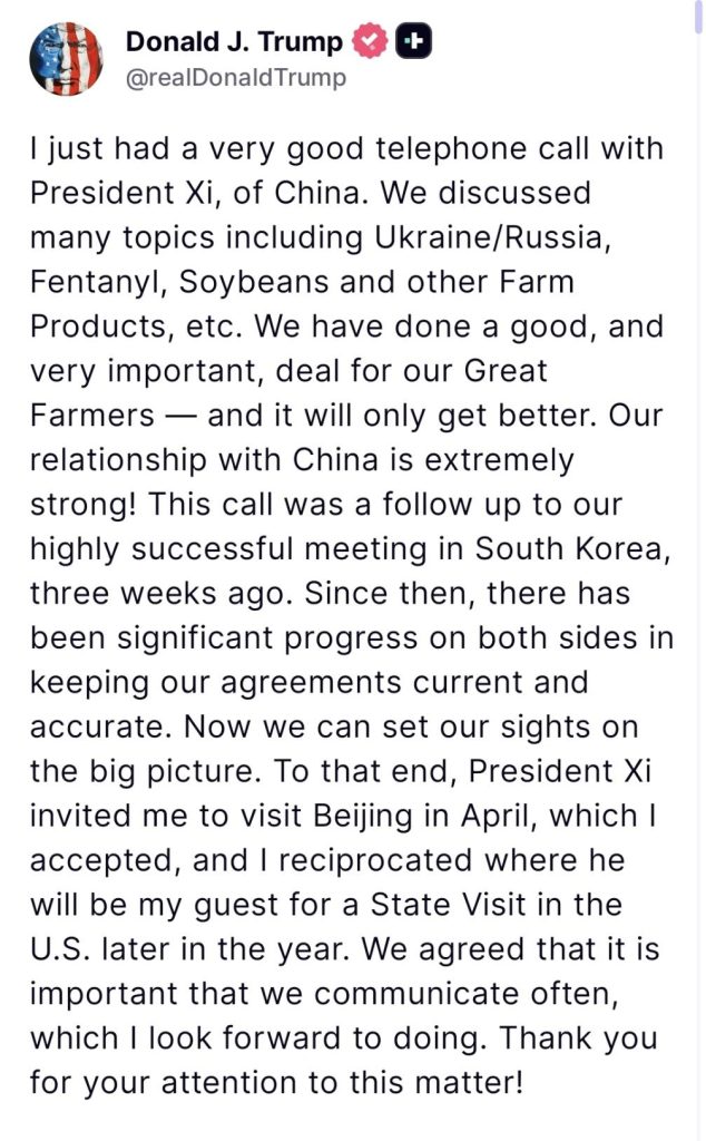 ผู้สื่อข่าวรายงานว่า วันนี้ (25 พ.ย. 2568) เวลา 00:39 น. นายโดนัลด์ ทรัมป์ ประธานาธิบดีสหรัฐอเมริกา เปิดเผยผ่านแพลตฟอร์ม Truth Social ว่าได้สนทนาทางโทรศัพท์กับประธานาธิบดีสี จิ้นผิง แห่งสาธารณรัฐประชาชนจีน โดยการพูดคุยครั้งนี้ครอบคลุมหลายประเด็นสำคัญด้านภูมิรัฐศาสตร์และเศรษฐกิจ ตั้งแต่สถานการณ์ยูเครน–รัสเซีย ปัญหาเฟนทานิล ไปจนถึงการค้าสินค้าเกษตร เช่น ถั่วเหลือง และผลิตภัณฑ์ฟาร์มอื่น ๆ ซึ่งถือเป็นประเด็นผลประโยชน์หลักของเกษตรกรสหรัฐฯ