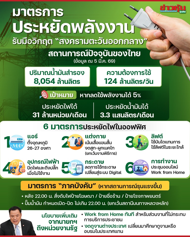 ด้านนายประเสริฐ สินสุขประเสริฐ ปลัดกระทรวงพลังงาน เปิดเผยว่า วันนี้ (23 มิ.ย.68) นายพีระพันธุ์ สาลีรัฐวิภาค รองนายกรัฐมนตรีและรัฐมนตรีว่าการกระทรวงพลังงาน เรียกประชุมด่วน ที่กระทรวงพลังงาน เพื่อติดตามและประเมินสถานการณ์ที่เกิดขึ้นในตะวันออกกลาง โดยเฉพาะการจ่อปิดช่องแคบฮอร์มุซ ทั้งนี้ ปลัดกระทรวงพลังงาน ยืนยันว่า ไทยมีพลังงานสำรองไปถึง 60 วัน ซึ่งถ้าเกิดการปิดช่องแคบฮอร์มุซจริง ต้องกำหนดมาตรการรับมือ เช่น ประหยัดพลังงานในประเทศ รวมถึงหาพลังงานทดแทน
