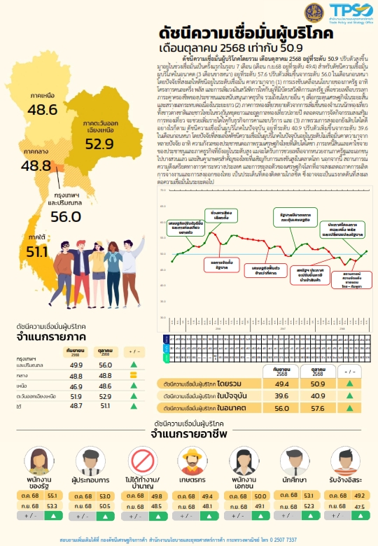 ดัชนีความเชื่อมั่นผู้บริโภคโดยรวม เดือนตุลาคม 2568 อยู่ที่ระดับ 50.9 ปรับตัวสูงขึ้นมาอยู่ในช่วงเชื่อมั่น เป็นครั้งแรกในรอบ 7 เดือน (เดือนกันยายน 2568 อยู่ที่ระดับ 49.4) สำหรับดัชนีความเชื่อมั่นผู้บริโภคในอนาคต (3 เดือนข้างหน้า) คาดว่า อยู่ที่ระดับ 57.6 ปรับตัวเพิ่มขึ้นจากระดับ 56.0 ในเดือนก่อนหน้า