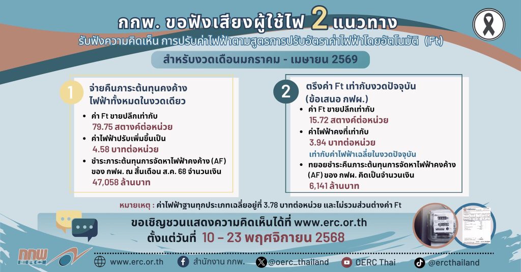 กกพ. จะเปิดรับฟังความคิดเห็นผ่านเว็บไซต์ของสำนักงาน ตั้งแต่วันที่ 10–23 พฤศจิกายน 2568 จากนั้นจะสรุปผลและประกาศค่า Ft อย่างเป็นทางการ ก่อนมีผลเรียกเก็บในรอบเดือนมกราคม–เมษายน 2569