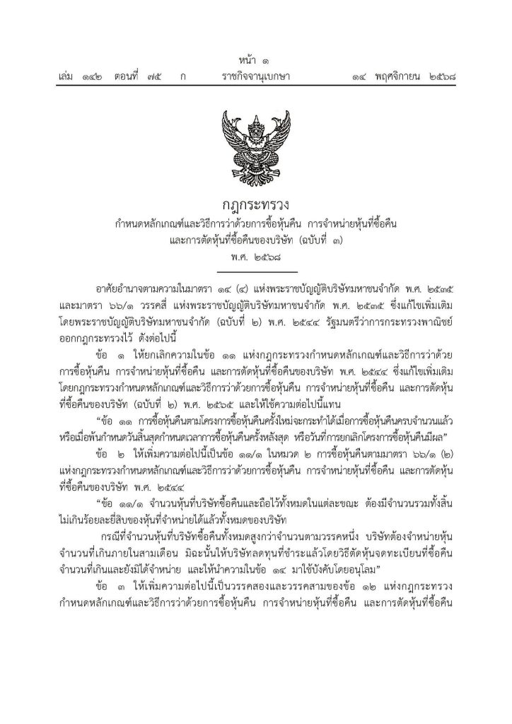 ผู้สื่อข่าวรายงานว่า นายพูนพงษ์ นัยนาภากรณ์ อธิบดีกรมพัฒนาธุรกิจการค้า กระทรวงพาณิชย์ เปิดเผยว่า กระทรวงพาณิชย์ประกาศบังคับใช้กฎกระทรวงกำหนดหลักเกณฑ์และวิธีการว่าด้วยการซื้อหุ้นคืน การจำหน่ายหุ้นที่ซื้อคืน และการตัดหุ้นที่ซื้อคืนของบริษัท (ฉบับที่ 3) พ.ศ. 2568 เป็นที่เรียบร้อยแล้ว โดยประกาศในราชกิจจานุเบกษา เล่ม 142 ตอนที่ 75 ก ลงวันที่ 14 พฤศจิกายน 2568