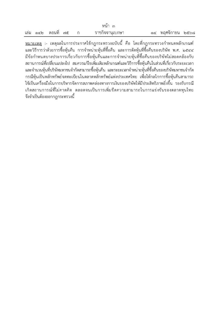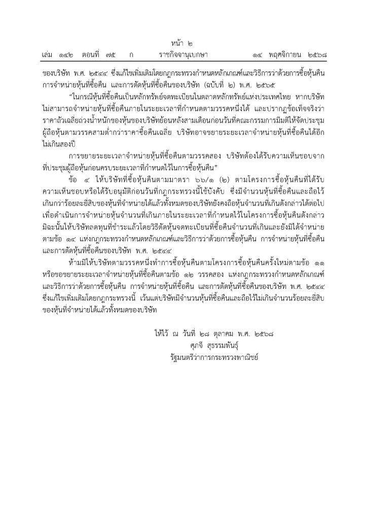 - ยกเลิกระยะเวลาพักคอย (Breaking Period) จากเดิมบริษัทมหาชนต้องรอ 6 เดือน ก่อนเริ่มโครงการซื้อหุ้นคืนใหม่ กฎกระทรวงฉบับนี้ปรับปรุงให้สามารถเริ่มโครงการใหม่ได้ทันทีโดยไม่ต้องรอ เพื่อเพิ่มความคล่องตัวในการบริหารทุนของบริษัท