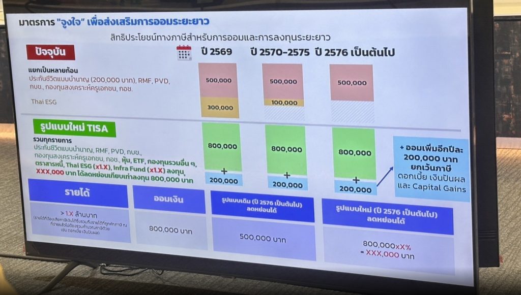 เพราะหาดูลงไปในรายละเอียดของโครงการตามที่กระทรวงการคลังและหน่วยงานที่เกี่ยวข้องเคยนำเสนอ TISA ถูกออกแบบให้เป็นบัญชีออม–ลงทุนเฉพาะ เพื่อจูงใจให้ประชาชนออมเงินระยะยาวผ่านกลไกตลาดทุน โดยมีการพูดถึงสิทธิประโยชน์ทางภาษี อาทิ เพดานการลดหย่อนสูงสุดไม่เกิน 800,000 บาทต่อปี รวมถึงการใช้ตัวคูณลดหย่อนที่แตกต่างกันตามระดับรายได้ ทั้งนี้ รายละเอียดดังกล่าวยังอยู่ในระดับแนวคิดและต้องรอความชัดเจนจากการพิจารณาเชิงนโยบาย