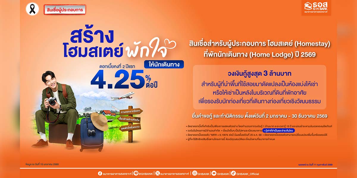 ธอส.เปิดโครงการสินเชื่อโฮมสเตย์ และ Home Lodge ปี 2569 หนุนผู้ประกอบการรายย่อยปรับปรุงที่พักรองรับท่องเที่ยวเชิงวัฒนธรรม กู้สูงสุด 3 ล้านบาท ดอกเบี้ยคงที่ 2 ปีแรก 4.25% ยื่นขอได้ถึง 30 ธันวาคม 2569