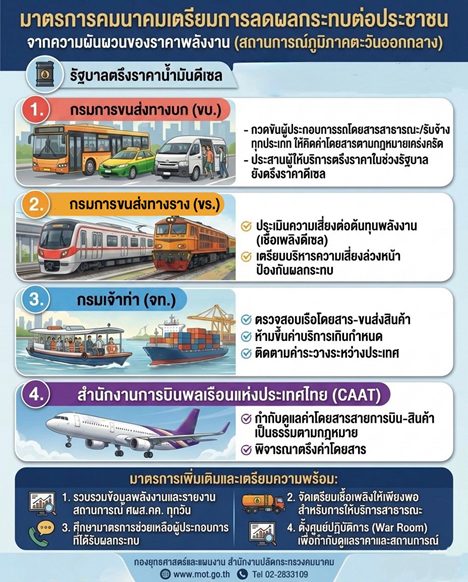 นอกจากนี้ ยังได้สั่งการให้ทุกหน่วยงานรวบรวมข้อมูลการใช้พลังงานในภาคการขนส่ง รายงานสถานการณ์ให้ศูนย์ปฏิบัติการเฝ้าระวังและเตือนภัย ด้านการคมนาคมทราบอย่างต่อเนื่อง เพื่อเตรียมความพร้อมในการจัดหาเชื้อเพลิงให้เพียงพอต่อการให้บริการสาธารณะ และศึกษามาตรการช่วยเหลือผู้ประกอบการ หากสถานการณ์ยืดเยื้อจนส่งผลกระทบต่อระบบขนส่ง