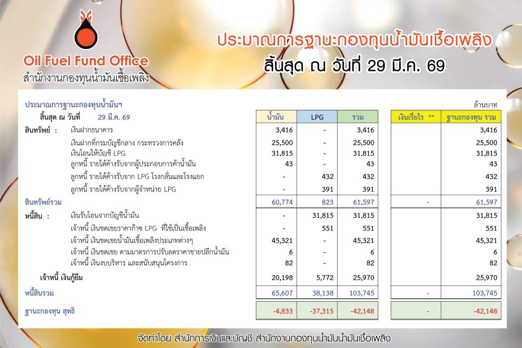 ผู้สื่อข่าวรายงานว่า วันนี้ (30 มี.ค.69) เวลา 16.35 น. สำนักงานกองทุนน้ำมันเชื้อเพลิง (Oil Fuel Fund Office) เปิดเผยประมาณการฐานะกองทุนน้ำมันเชื้อเพลิง ณ วันที่ 29 มีนาคม 2569 พบว่า ฐานะกองทุนสุทธิติดลบ 42,148 ล้านบาท แบ่งเป็น บัญชีน้ำมันติดลบ 4,833 ล้านบาท และบัญชี LPG ติดลบ 37,315 ล้านบาท