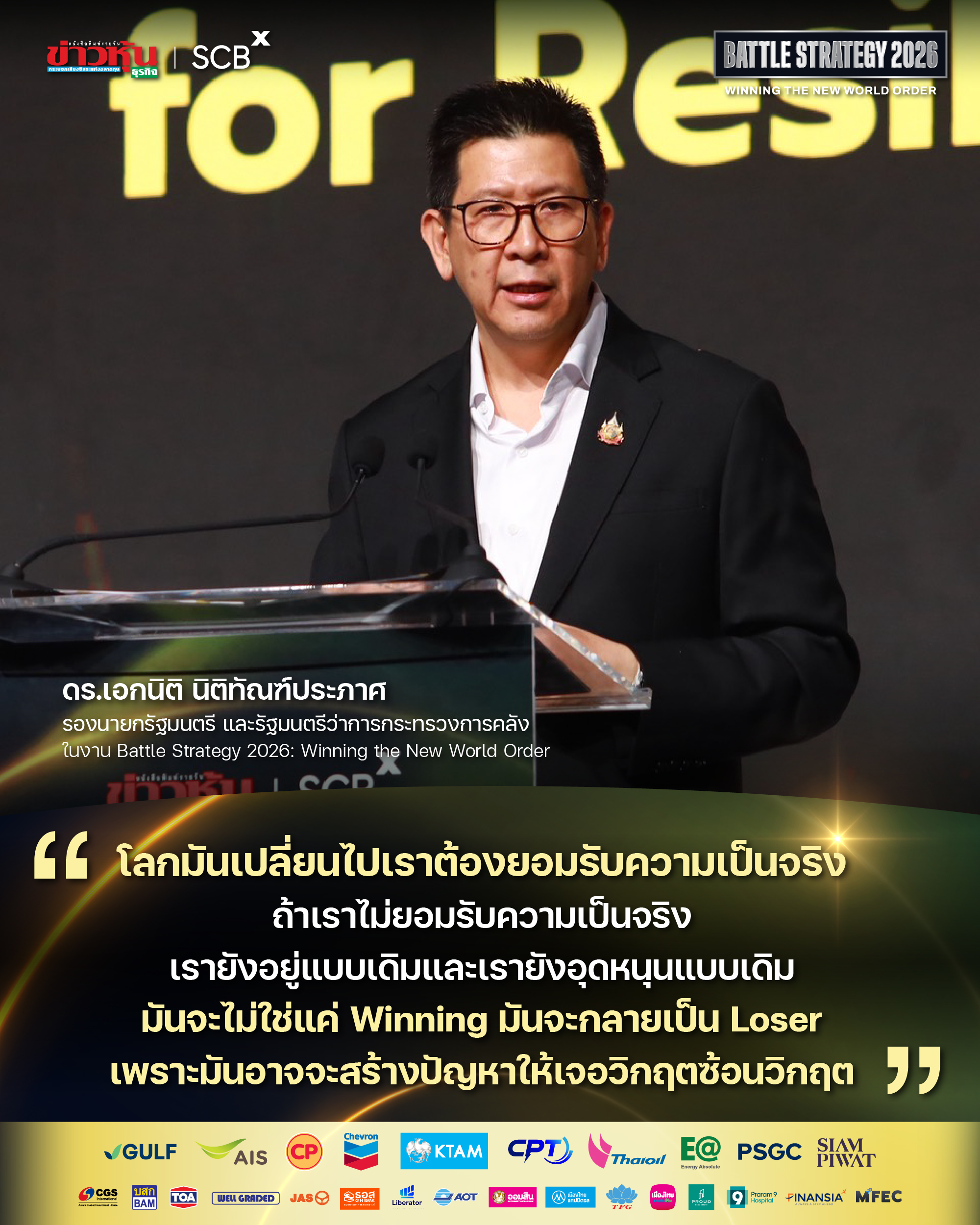 ผู้สื่อข่าวรายงานว่า วันนี้ (31 มี.ค.69) นายเอกนิติ นิติทัณฑ์ประภาศ รองนายกรัฐมนตรีและรัฐมนตรีว่าการกระทรวงการคลัง กล่าวเปิดงานสัมมนา Battle Strategy 2026: Winning the New World Order พลิกเกมรบ ชิงชัยเศรษฐกิจ ทะยานสู่เป้าหมาย GDP 3% บนสมรภูมิระเบียบโลกใหม่ ณ PARAGON HALL ชั้น 5 ศูนย์การค้าสยามพารากอน