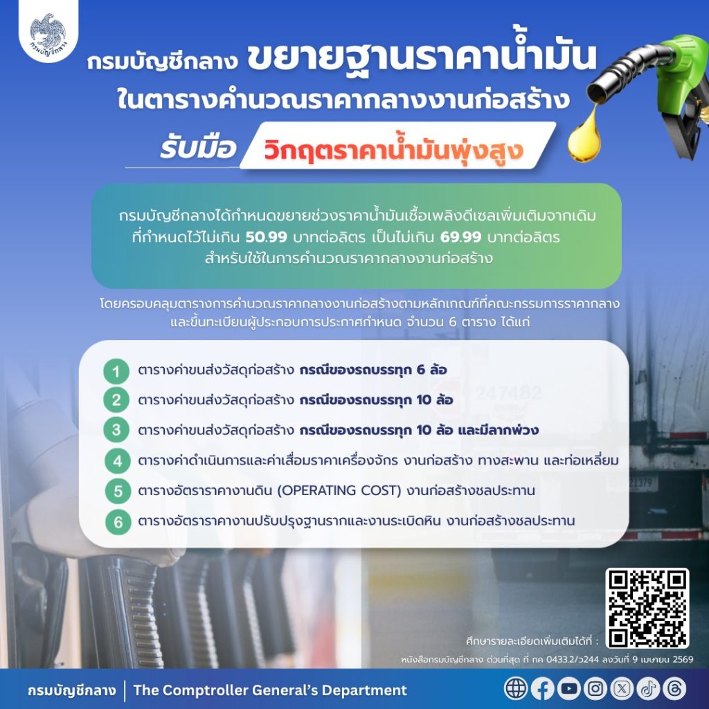 ทั้งนี้ กรมบัญชีกลางได้ขยายช่วงราคาน้ำมันเชื้อเพลิงดีเซล สำหรับใช้ในการคำนวณราคากลางงานก่อสร้าง จากเดิมกำหนดไม่เกิน 50.99 บาทต่อลิตร เป็นไม่เกิน 69.99 บาทต่อลิตร