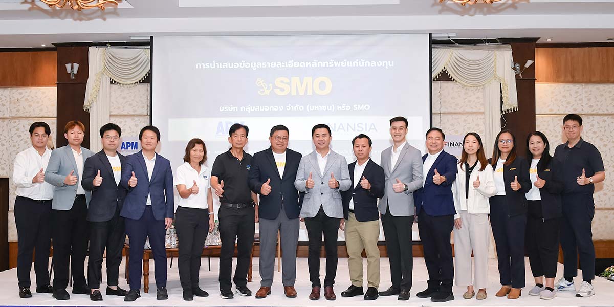 นายกิตติพงษ์ พวงมาลา ประธานเจ้าหน้าที่บริหาร นายกุศล ศรีเปารยะ ประธานเจ้าหน้าที่บริหารการเงิน นายศักดา ทองรอง รองกรรมการผู้จัดการอาวุโส สายงานสำนักงาน บริษัท กลุ่มสมอทอง จำกัด (มหาชน) หรือ SMO หนึ่งในผู้นำในการผลิตและจำหน่ายน้ำมันปาล์มดิบของประเทศไทย ซึ่งมีโรงงาน 4 จุดครอบคลุมพื้นที่ยุทธศาสตร์สำคัญของปาล์มน้ำมัน และธุรกิจผลิตและจำหน่ายไฟฟ้าจากเชื้อเพลิงก๊าซชีวภาพ พร้อมด้วยดร.สมภพ ศักดิ์พันธ์พนม ประธานกรรมการ นายสุริยา ธรรมธีระ รองกรรมการผู้จัดการ บริษัท แอสเซท โปร แมเนจเม้นท์ จำกัด หรือ APM ในฐานะที่ปรึกษาทางการเงินและนายภควัฒน์ ตุลยนิติกุล ผู้อำนวยการอาวุโส บริษัทหลักทรัพย์ ฟินันเซียไซรัส จำกัด (มหาชน) ในฐานะแกนนำการจัดจำหน่ายและรับประกันการจำหน่าย ร่วมนำเสนอข้อมูลธุรกิจ วิสัยทัศน์ ข้อมูลทางการเงิน และศักยภาพการเติบโตของบริษัท ให้แก่นักลงทุนในจังหวัดราชบุรี โดยมีนักลงทุนให้ความสนใจเข้าร่วมรับฟังข้อมูลเป็นจำนวนมาก โดยมีนักลงทุนให้ความสนใจเข้าร่วมรับฟังข้อมูลเป็นจานวนมาก ณ ห้องประชุมกัลปพฤกษ์ ชั้น 2 โรงแรมเวสเทิร์นแกรนด์ราชบุรี จ.ราชบุรี