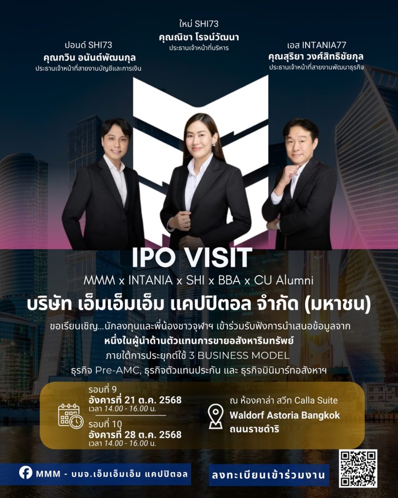 MMM เชิญศิษย์เก่า CU, Intania, SHI และ BBA ร่วมงาน “MMM x ศิษย์เก่าจุฬาฯ” เจาะลึกข้อมูลธุรกิจ กลยุทธ์การเติบโต และแผนเข้าตลาด mai ในไตรมาส 4/68 โดยผู้บริหาร MMM พร้อมช่วง Q&A วันที่ 21 และ 28 ต.ค. 68 ที่โรงแรม Waldorf Astoria Bangkok