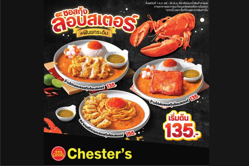 ล่าสุดเชสเตอร์เปิดตัวเมนูใหม่ “ซอสกุ้งล็อบสเตอร์” เพื่อมอบประสบการณ์มื้อพิเศษให้กับลูกค้าทั่วประเทศ ที่เริ่มจำหน่ายตั้งแต่วันที่ 1 ตุลาคมที่ผ่านมา ตอบโจทย์กลุ่มผู้บริโภค Premium Mass ที่ต้องการความอร่อยแบบพรีเมียมในราคาที่เข้าถึงได้ จุดเด่นอยู่ที่ซอสกุ้งล็อบสเตอร์รสชาติเข้มข้น กลมกล่อม และหอมกลิ่นกุ้งล็อบสเตอร์ เสิร์ฟพร้อมน้ำจิ้มซีฟู้ดรสแซ่บ เป็นเมนูที่ผสมผสานระหว่างรสชาติคุ้นเคยและความหรูหราในจานเดียว ในราคาเริ่มต้นเพียง 135 บาท มีให้เลือก 3 เมนู คือ ข้าวไก่เผ็ดซอสกุ้งล็อบสเตอร์ / ข้าวไก่กรอบซอสกุ้งล็อบสเตอร์ (ราคา 135 บาท) และสปาเกตตีซอสกุ้งล็อบสเตอร์ (ราคา 155 บาท)