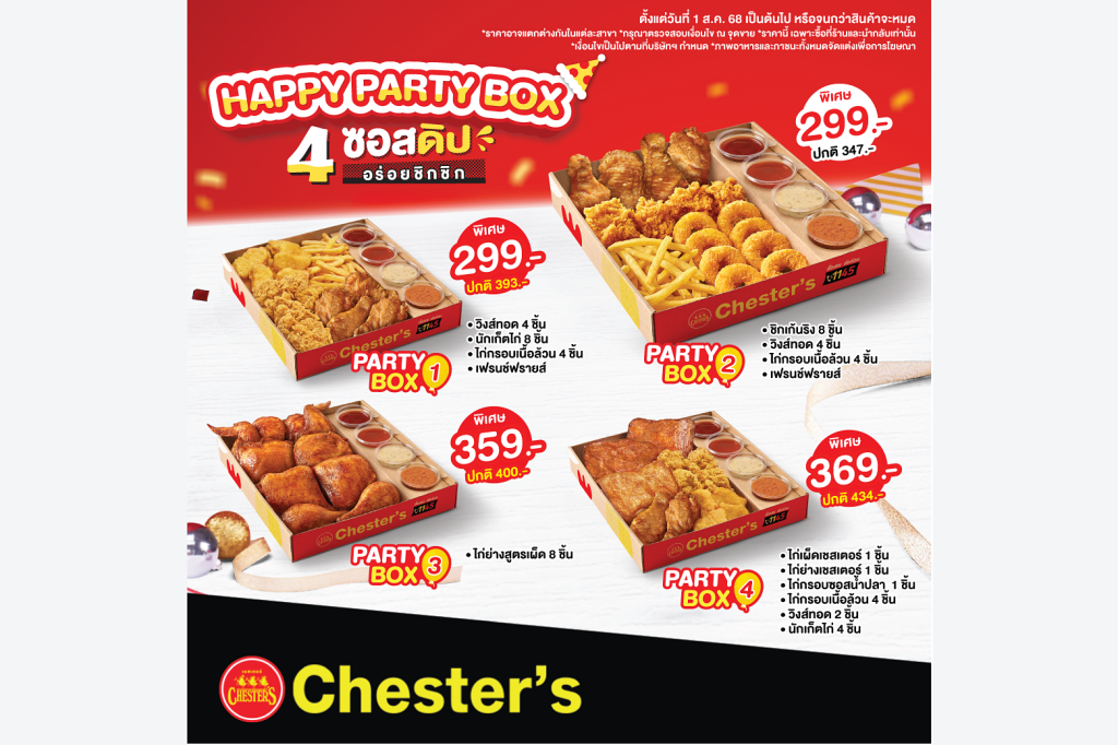 จากข้อมูลเชิงพฤติกรรมของเชสเตอร์ พบว่า ลูกค้ามีแนวโน้มเลือกเมนูที่รับประทานและแชร์ร่วมกันได้มากขึ้น รวมถึงให้ความสำคัญกับความคุ้มค่า ความสะดวก และรสชาติที่คุ้นเคยแต่มีความพิเศษเพิ่มขึ้นในช่วงเทศกาล เมนูใหม่และชุด Party Box ของเชสเตอร์จึงถูกออกแบบมาเพื่อตอบโจทย์ช่วงเวลานี้โดยเฉพาะ