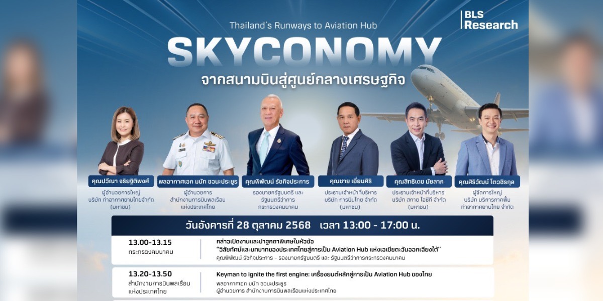 บล.บัวหลวง ชวนร่วมสัมมนา “SKYCONOMY” 28 ต.ค.68 เปิดวิสัยทัศน์ไทยสู่ Aviation Hub พร้อมฟังผู้นำองค์กรการบิน–คมนาคม–โครงสร้างพื้นฐาน วิเคราะห์ศักยภาพเศรษฐกิจท้องฟ้าไทย