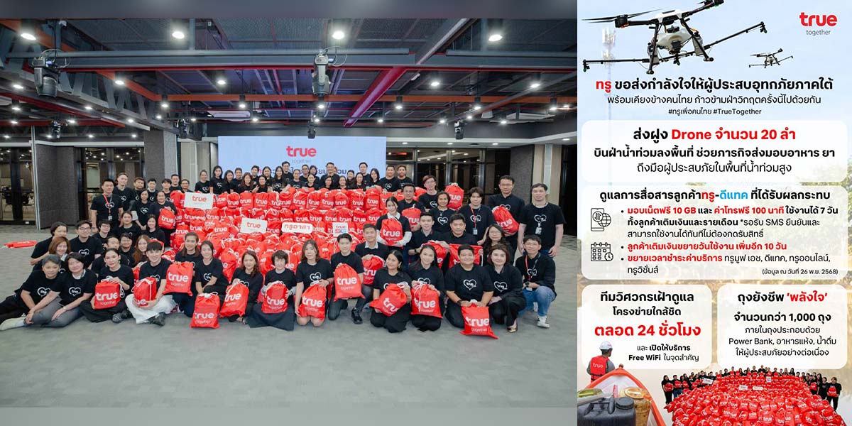 TRUE เดินหน้าช่วยผู้ประสบอุทกภัยภาคใต้ ระดมฝูงโดรน 20 ลำลำเลียงของจำเป็นเข้าพื้นที่ยากเข้าถึง พร้อมจัดถุงยังชีพกว่า 1,000 ชุด ออกมาตรการดูแลลูกค้า และเสริมสัญญาณสื่อสารตลอด 24 ชั่วโมง ร่วมประสานหลายหน่วยงานบรรเทาความเดือดร้อนประชาชน