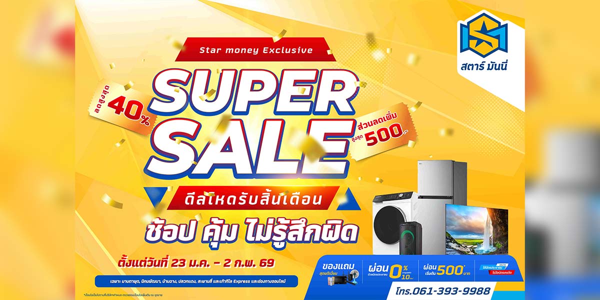STARM จัดแคมเปญ “Star Money Exclusive Super Sale 2026” ชูเครื่องใช้ไฟฟ้าแบรนด์ดังลดสูงสุด 40% พร้อมส่วนลดเพิ่มเติมสูงสุด 500 บาท และของแถมพรีเมียมสำหรับสินค้าที่ร่วมรายการ หวังกระตุ้นยอดขายช่วงต้นปี