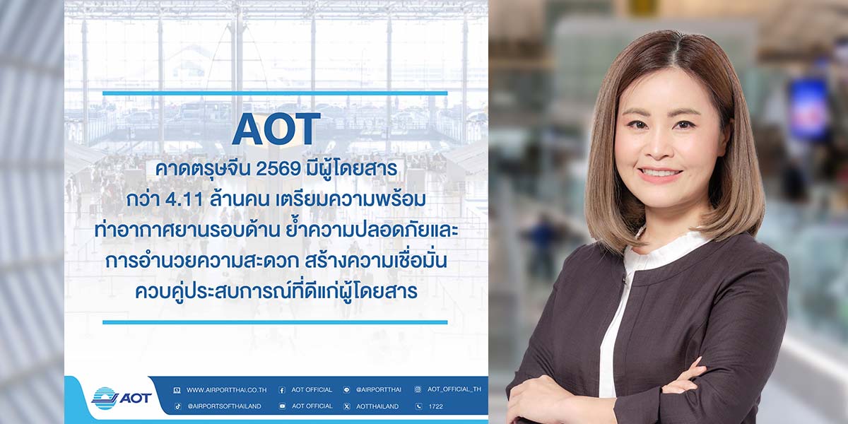 นางสาวปวีณา จริยฐิติพงศ์ กรรมการผู้อำนวยการใหญ่ AOT กล่าวว่า AOT คาดว่าในช่วงเทศกาลตรุษจีน ระหว่างวันที่ 13 – 22 กุมภาพันธ์ 2569 มีผู้โดยสารเดินทางผ่านท่าอากาศยานทั้ง 6 แห่ง ได้แก่ ท่าอากาศยานสุวรรณภูมิ (ทสภ.) ท่าอากาศยานดอนเมือง ท่าอากาศยานเชียงใหม่ ท่าอากาศยานแม่ฟ้าหลวง เชียงราย ท่าอากาศยานภูเก็ต และท่าอากาศยานหาดใหญ่ จำนวนกว่า 4.11 ล้านคน แบ่งเป็นผู้โดยสารระหว่างประเทศประมาณ 2.6 ล้านคน และผู้โดยสารภายในประเทศประมาณ 1.51 ล้านคน