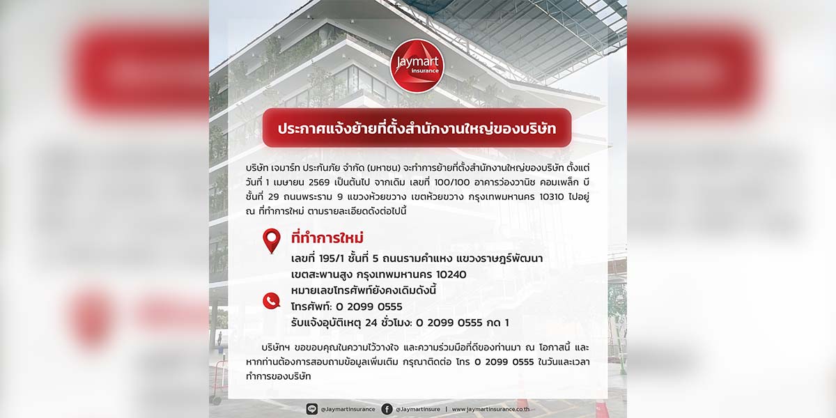 “เจมาร์ท ประกันภัย” แจ้งย้ายสำนักงานใหญ่ สู่รามคำแหง เริ่ม 1 เม.ย. 69
